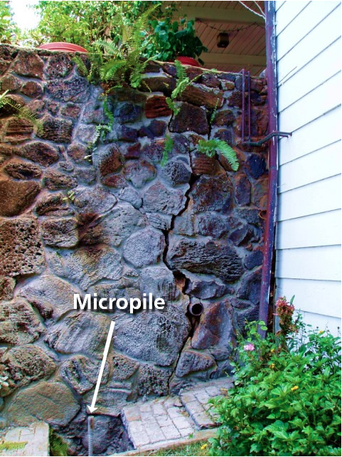 Solution: Grout-injection Micropiles installed straight down and at angles into walls (Tie-back Anchors) and water redirected.
