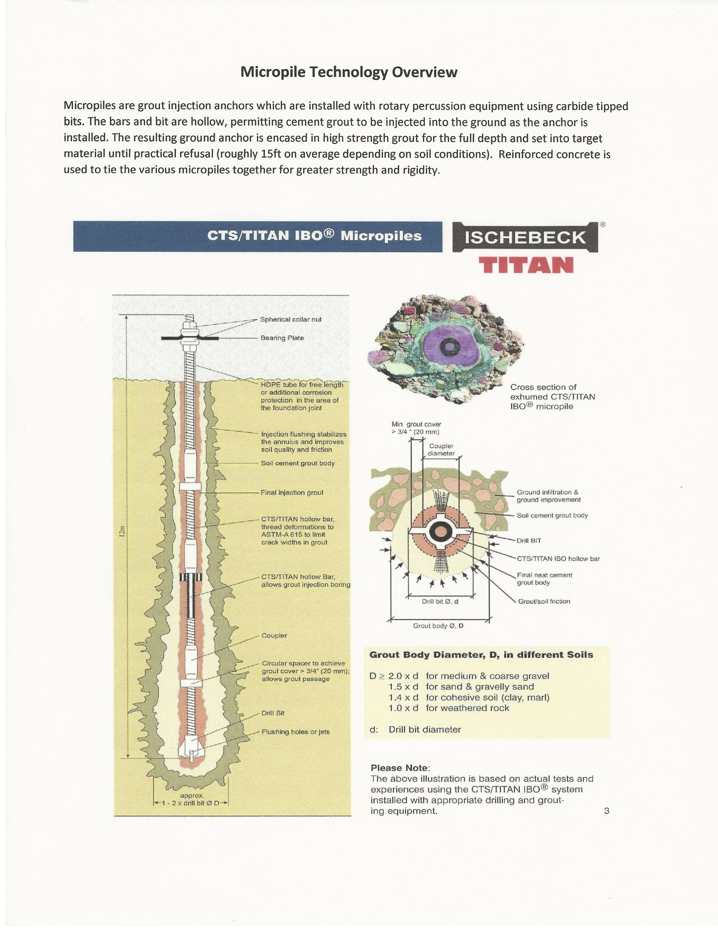 Micropiles are deep foundation piles comprised of high-strength, small-diameter hollow steel threaded bars. Typically less then 12 inches in diameter, they are drilled into the soil. Grout is injected into the ground through the end of the micropile and acts to fill any voids around the pile creating a strong weight supporting anchor that is tied into a structure's foundation. They are commonly used to strengthen and replace failing foundation systems in addition to reinforcing ebankments/slopes and provide landslide stabilization. The advantage of using micropiles is the ability to install in tight access areas with low headroom — allowing installation under existing structures. Micropile installation is our specialty.