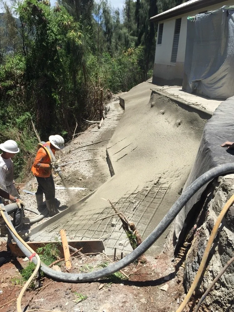 Solution: We replaced failing lava rockwall with new shotcrete retaining wall carved & stained to look like lava. Micropiles and tieback anchors implemented in stairs and hillside foundation of house.